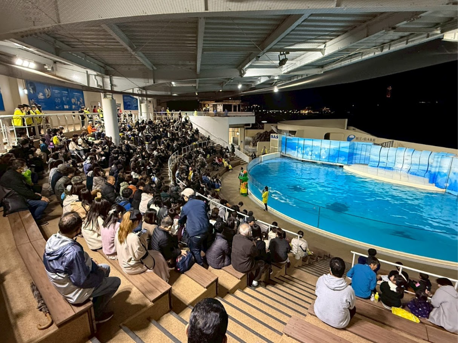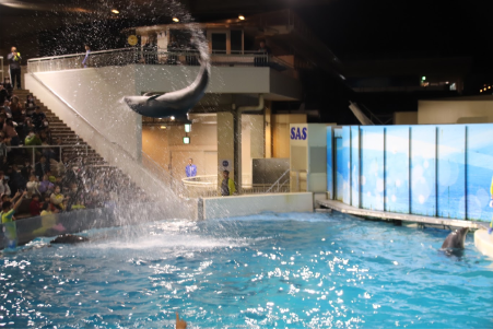 第一部ご招待のお客様に向けて行われたイルカショーでは、ダイナミックなパフォーマンスに会場から大きな歓声が上がりました。